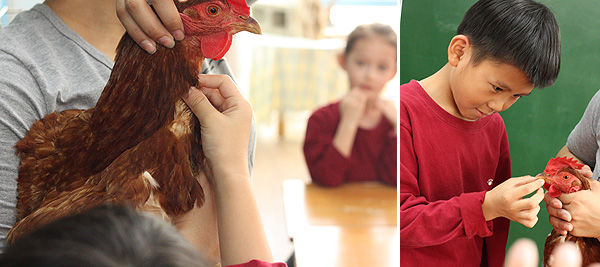 我們把兩隻母雞帶回教室,孩子們很興奮地靠近雞籠,眼睛盯著母雞直瞧,每次母雞出現動作,不管是走幾步、伸展翅膀,或是啼叫幾聲,大家就會開心地哈哈大笑。仔細觀察雞,配合黑板上老師畫的圖形,孩子們逐步認識了鳥類的外觀。認識了鳥類各部位的名稱後,大家觀察得更起勁了,彩繪記錄的圖形也更仔細了。