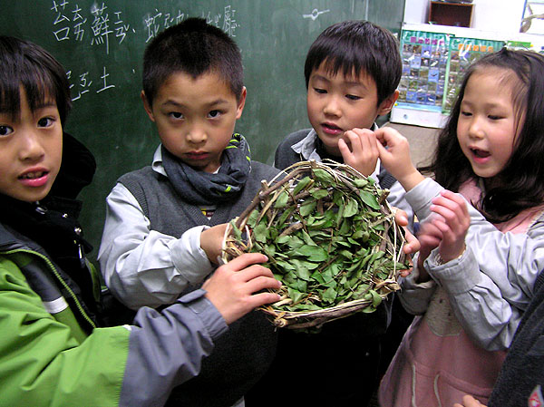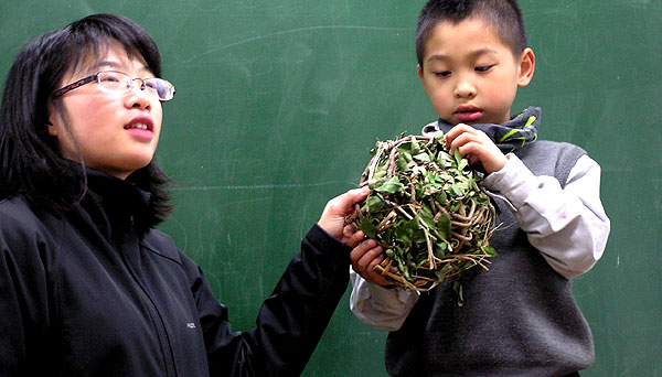奕叡帶來了一個鳥巢,這個鳥巢看起來很不一樣,我們請奕叡上台介紹。原來這個鳥巢是他與爸爸一起做的,他用的材料有:樹藤、枯葉、枯枝與新鮮的綠葉。為什麼還要放葉子在鳥巢裡呢?原來這是為了讓雛鳥在巢裡能窩得更舒服,所以平時親鳥還會用羽毛、碎布等柔軟的物品舖在鳥巢裡,這可是當父母的為自己的下一代所特別準備的喔!