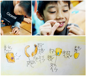 我們將花豆種子泡水發脹,剝開最外面的「種皮」,裡面可分為三個部份:兩片「子葉」和「胚」,子葉是儲存種子養分的部位,養分可以提供給種子發芽時使用,「胚」是發育成根莖葉的地方,我們將種子內部構造及名稱紀錄下來,加深印象。