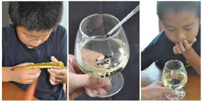 「色水在沙拉油裡,變成珍珠了,不會像顏料一樣和水溶在一起。」