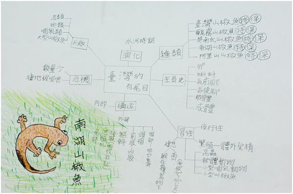 大家共同閱讀了台灣的無尾目∼山椒魚的資料,並且整理成主題網的形式呈現。