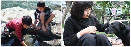一到河邊,孩子們都迫不及待地脫下鞋襪,讓雙腳享受一下天然的清涼。一下子捉蝌蚪的、蓋水壩的、泡野溪溫泉的都各自就戰鬥位置, 只等老師一聲令下,就要開始他們的遊戲時間。