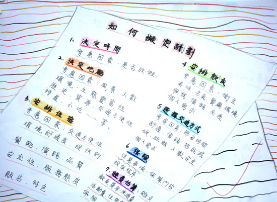 擬定旅行計畫的注意事項: 在決定時間、地點、安排住宿、安排飲食、決定交通方式、保險、經費估算有許多需要考慮的因素,設想周到之後便可開始著手進行。