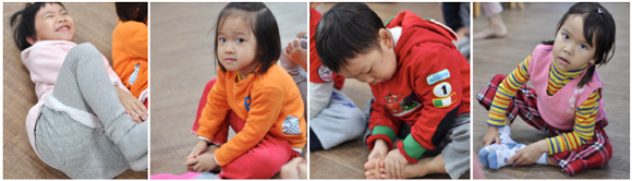孩子們對這些身體動作,覺得既新奇又好玩,有時自己要當個不倒翁,倒過來又倒過去,要維持動作不讓自己真的翻倒,但身體又必須傾斜。有時得做個鏡子,跟得芬老師做相同的動作,對於孩子們是一個有趣的遊戲。