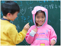 在有語桐的兔子妝經驗後,我們想另外做化妝的挑戰,於是我們開始分組來當化妝師和被化妝的模特兒。最後大家畫上了癮,乾脆每個人都還化妝,瞬間教室變成了化裝舞會一樣,大家都變成了一個個的怪獸,想要回家嚇爸爸媽媽。