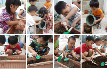教室外的中庭有許多的盆栽,歷經一個暑假,有些植物已枯萎,大家一起動手整理。孩子把盆栽裡枯掉的枝葉摘除, 將土倒出來集中在一起。小孩一邊倒土一邊驚呼連連,「有蟲!」、「有小蟑螂!」、「螞蟻耶!」,沒想到土裡躲了這麼多生物。和大家討論這個問題,有人表示沒看清楚,想要用放大鏡觀察。可是,看了老半天還是沒見著。有的小孩把土挖起來看,有小孩則不敢碰土,為什麼?「我覺得土濕濕的,我不敢摸」小孩表示,「我們以前在羊房子那邊也有挖土」,「可是那邊的土是乾乾的,我才敢摸」大家紛紛表示一己之見。有人提出曬土的想法,「用太陽將土曬乾,會讓東西溫溫的」,為什麼會想到曬土呢?