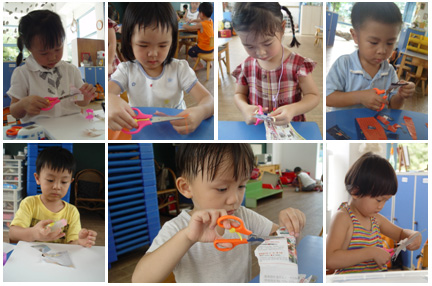 。孩子學很快,經過示範和實際操作練習,除了學到使用方法外,也注意到工具使用的安全性。大家特愛剪東西,有些孩子已經會沿著圖案的線剪,或是剪出更細小的圖形,而膠水的使用,不會再有猛力擠半罐的情形,會依要黏的大小來塗抹面積。總之,孩子許多動作的精確度提高,協調能力也增加了。