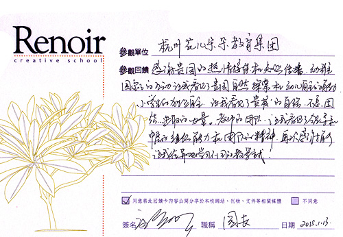 感謝貴園的熱情接待,和知識傳播,幼稚園的互動讓我看見了貴園自然探索和幼兒自主的能力, 小學生的獨立自主,讓我看見了貴校的自強、不息、團結…進取的力量。 老師的團隊讓我看見了領導和中層的組職能力和團隊的精神,再次感謝能讓我在異地學習不同的教學方式!